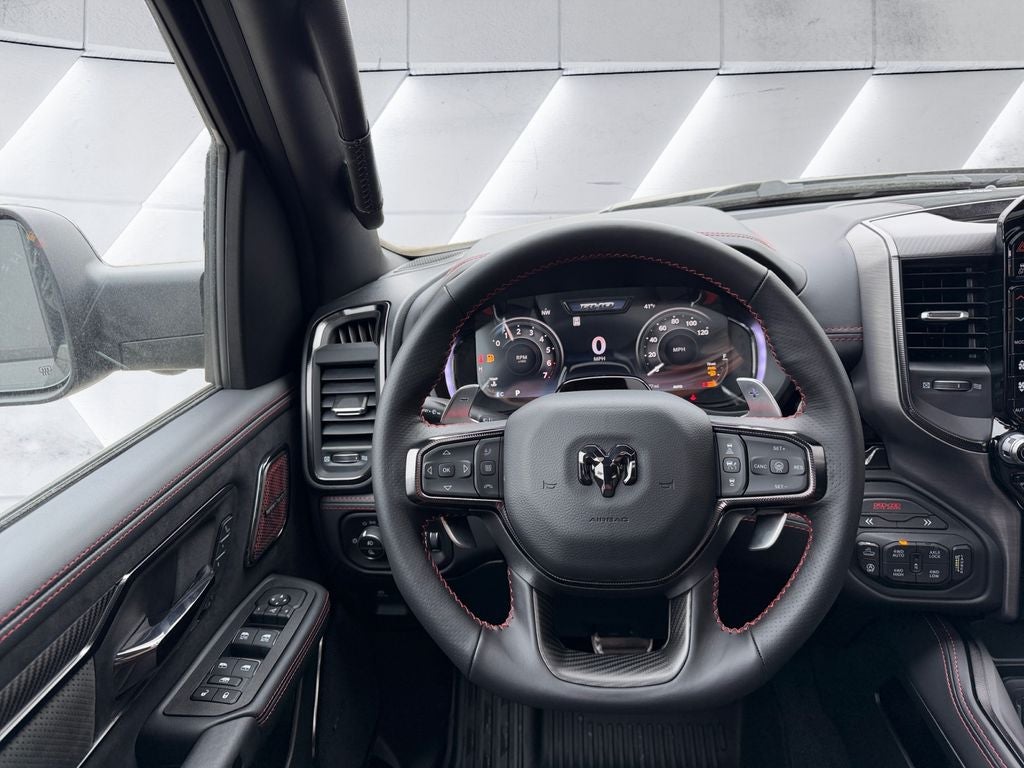 Elevate your driving experience with the stunning Diamond Black Crystal Pearlcoat exterior, complemented by the Red Interior Accents and MOPAR RHO graphics that give this truck a bold, distinctive presence on the road.